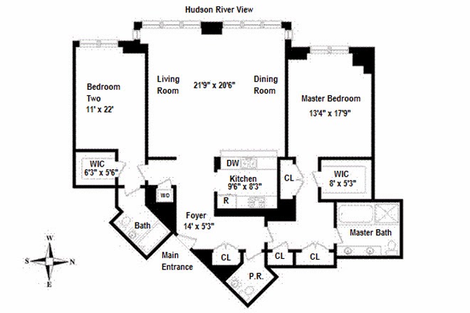 The residence is a part of the 1 Morton Square apartment building located in the West Village. The 1,736-square-foot condo has two bedrooms, two full and one half bathrooms. Boasting 11-foot high ceilings, hardwood flooring and floor-to-ceiling glass windows, the home offers ample views of the Hudson River.